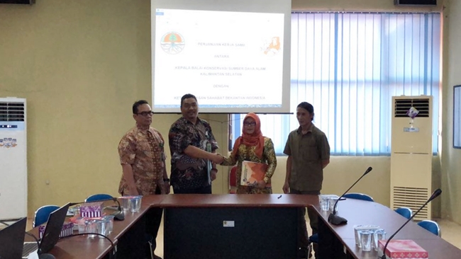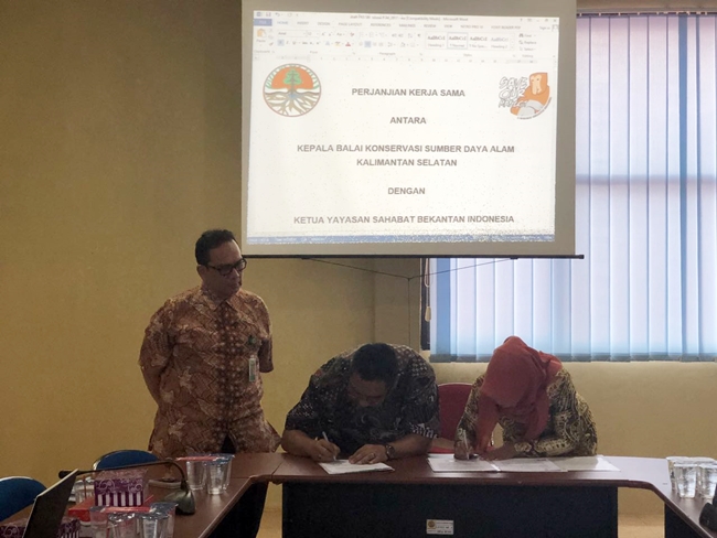 BANJARBARU – Pada hari jumat tanggal 27 juli 2018, Kepala BKSDA Kalimantan Selatan Dr. Ir Mahrus Aryadi M.Sc dengan Ketua Yayasan Sahabat Bekantan Indonesia Amalia Rezeki, S.Pd.,M.Pd telah menandatangani perjanjian kerja sama tentang Penguatan Fungsi Tentang Penguatan Fungsi KSA dan KPA Serta Konservasi Keanekaragaman Hayati di Kalimantan Selatan.