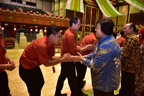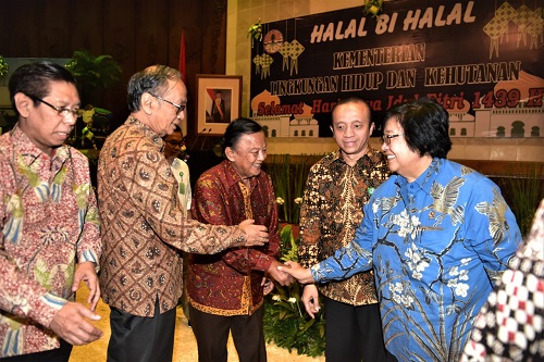JAKARTA – Kementerian Lingkungan Hidup dan Kehutanan (KLHK), Kamis, 21 Juni 2018. Hari pertama kerja pasca libur dan cuti bersama Hari Raya Idul Fitri 1439 H, Menteri Lingkungan Hidup dan Kehutanan (LHK), Siti Nurbaya menggelar Halal bi Halal dengan seluruh karyawan dan karyawati Kementerian LHK, Staf Khusus Menteri, mantan Menteri LH, Kepala BRG, Penasehat Senior Menteri, Tenaga Ahli Menteri, para mitra kerja, pimpinan dunia usaha dan rekan jurnalis.